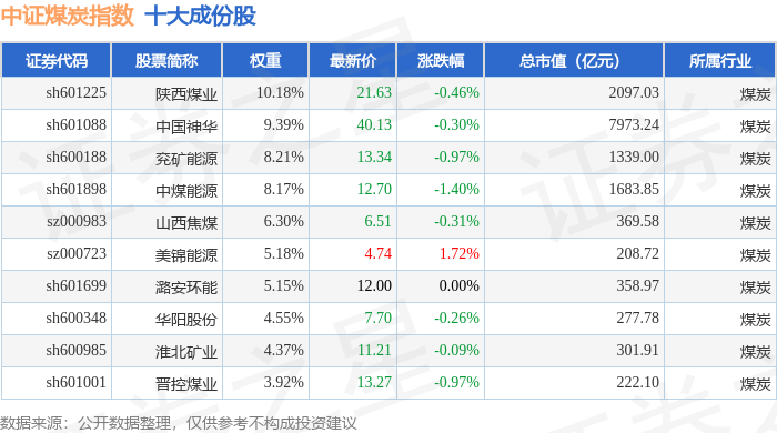 证券之星消息,12月25日,中证煤炭(399998)指数报收于1986.48点,跌0.24%,成交39.37亿元,换手率0.47%。当日该指数成份股中,上涨的有13家,美锦能源以1.72%的涨幅领涨,下跌的有14家,中煤能源以1.4%的跌幅领跌。