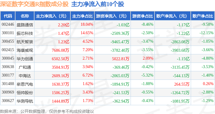 资金流向方面,深证数字交通R(470049)指数成份股当日主力资金净流出合计1.24亿元,游资资金净流出合计3738.23万元,散户资金净流入合计1.62亿元。成份股资金流向详情见下表: