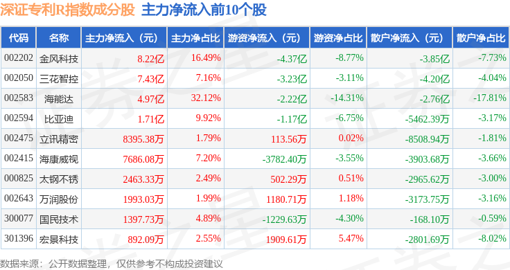 资金流向方面,深证专利R(470067)指数成份股当日主力资金净流出合计11.13亿元,游资资金净流出合计5.04亿元,散户资金净流入合计16.17亿元。成份股资金流向详情见下表: