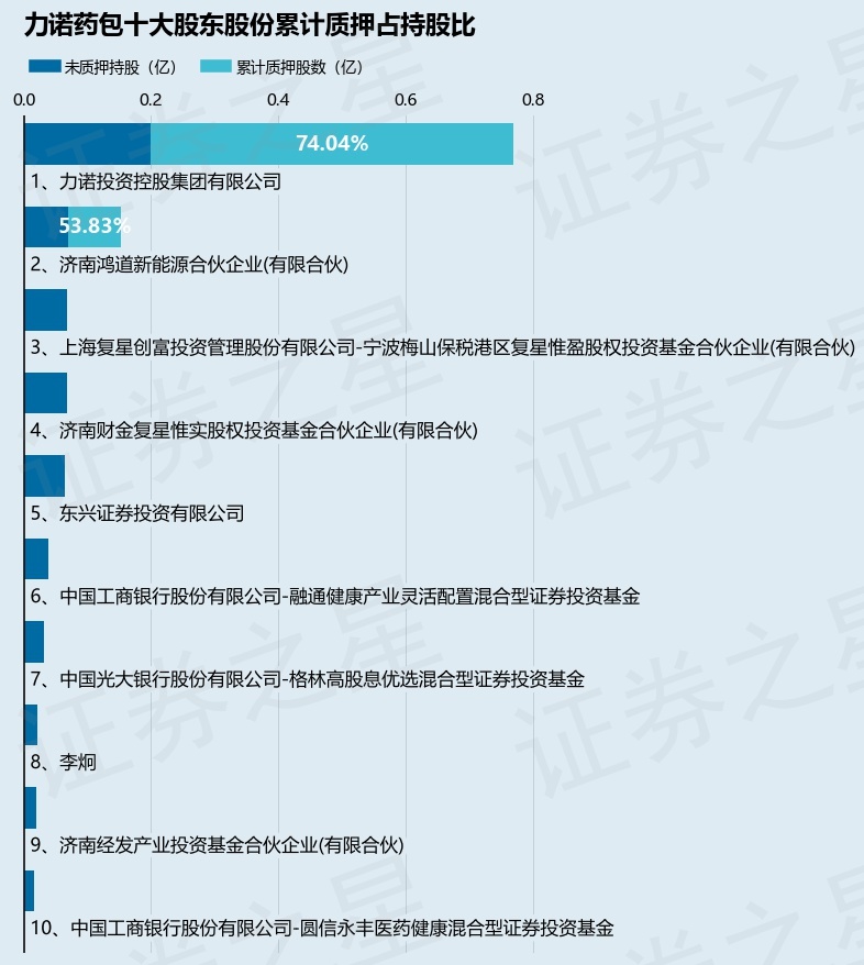 截止本公告日,股东力诺投资控股集团有限公司已累计质押股份5693.0万股,占其持股总数的74.04%,股东济南鸿道新能源合伙企业(有限合伙)已累计质押股份817.0万股,占其持股总数的53.83%。本次质押后力诺药包十大股东的累计质押股份占持股比例(占持股比例的计算以公司最新一期财务报表公布的十大股东的持股总数为基准)见下图: