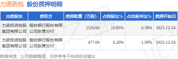证券之星消息,力诺药包(301188)12月25日公开信息显示,股东力诺投资控股集团有限公司向烟台银行股份有限公司东营分行合计质押2003.0万股,占总股本8.37%。质押详情见下表: