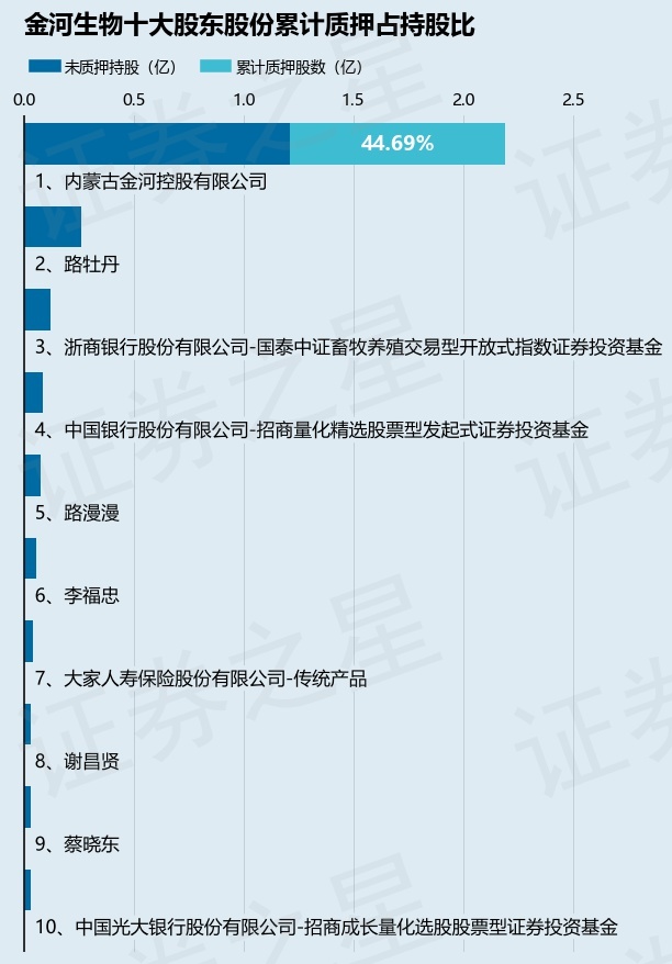 截止本公告日,股东内蒙古金河控股有限公司已累计质押股份9795.0万股,占其持股总数的44.69%。本次质押后金河生物十大股东的累计质押股份占持股比例(占持股比例的计算以公司最新一期财务报表公布的十大股东的持股总数为基准)见下图:
