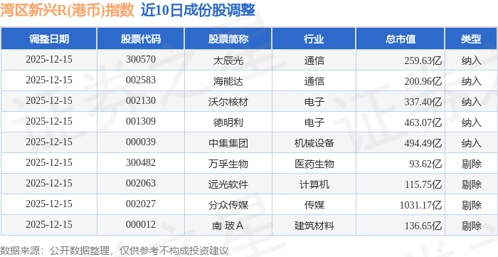 近10日内湾区新兴R(港币)(480008)指数成份股做了调整,新纳入了5只股票,剔除了4只股票。