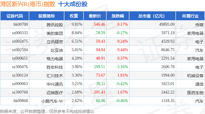 湾区新兴R(港币)(480008)指数十大成份股详情如下: