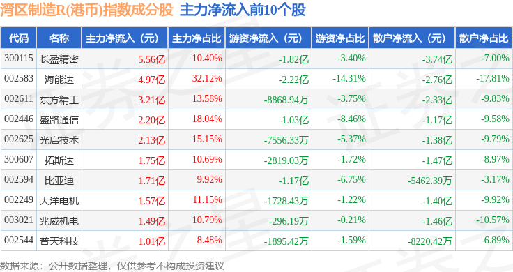 资金流向方面,湾区制造R(港币)(480010)指数成份股当日主力资金净流出合计26.6亿元,游资资金净流入合计6.88亿元,散户资金净流入合计19.72亿元。成份股资金流向详情见下表: