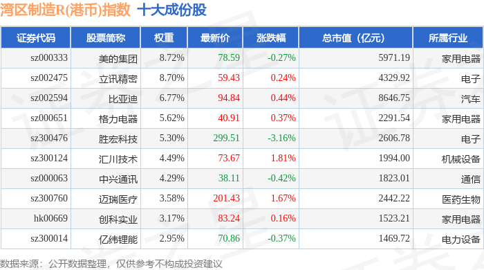 湾区制造R(港币)(480010)指数十大成份股详情如下: