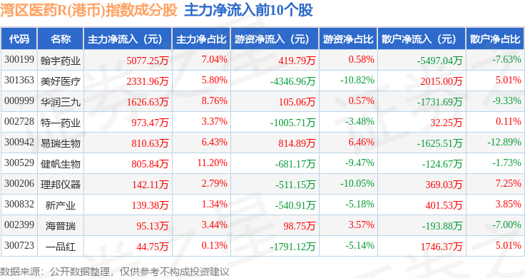 资金流向方面,湾区医药R(港币)(480014)指数成份股当日主力资金净流出合计1909.53万元,游资资金净流出合计6510.56万元,散户资金净流入合计8420.09万元。成份股资金流向详情见下表: