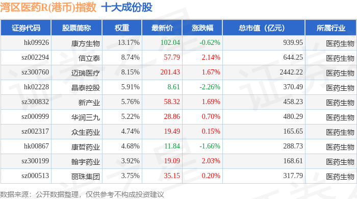 湾区医药R(港币)(480014)指数十大成份股详情如下: