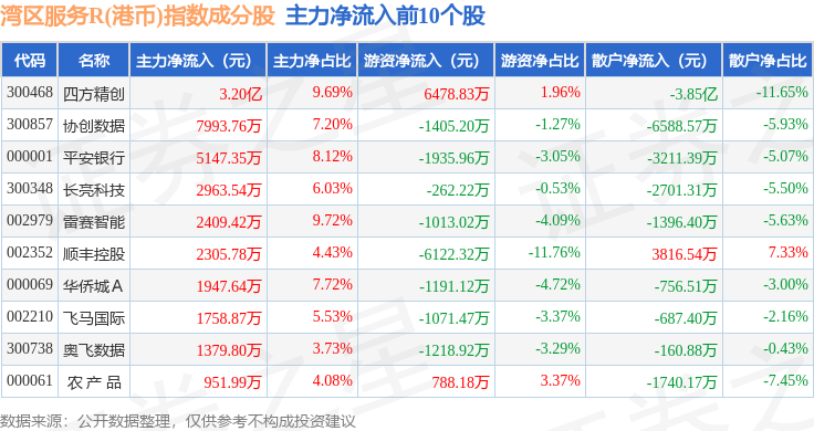 资金流向方面,湾区服务R(港币)(480012)指数成份股当日主力资金净流出合计2.02亿元,游资资金净流入合计4274.69万元,散户资金净流入合计1.6亿元。成份股资金流向详情见下表: