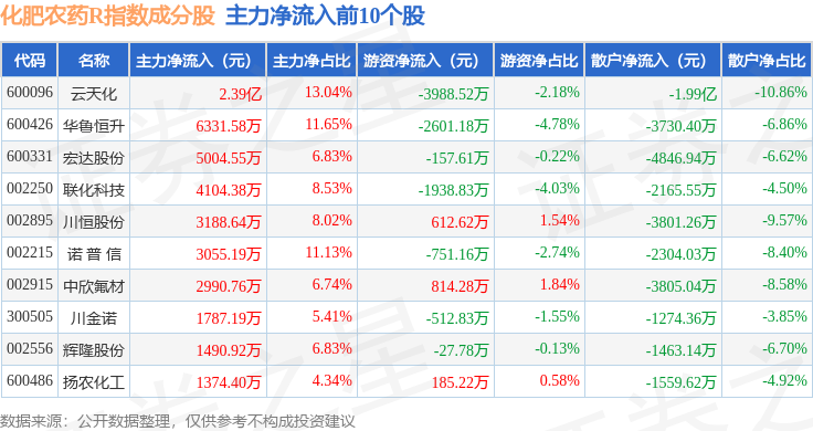 资金流向方面,化肥农药R(480035)指数成份股当日主力资金净流出合计6851.96万元,游资资金净流出合计1793.1万元,散户资金净流入合计8864.0万元。成份股资金流向详情见下表: