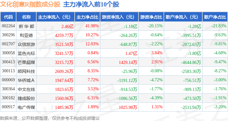 资金流向方面,文化创意R(480046)指数成份股当日主力资金净流出合计9.91亿元,游资资金净流入合计1.29亿元,散户资金净流入合计8.62亿元。成份股资金流向详情见下表: