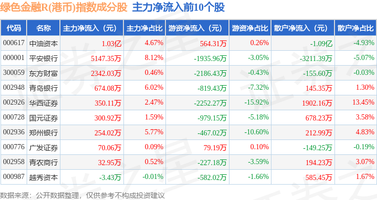 资金流向方面,绿色金融R(港币)(480053)指数成份股当日主力资金净流出合计1.38亿元,游资资金净流出合计3718.77万元,散户资金净流入合计1.76亿元。成份股资金流向详情见下表: