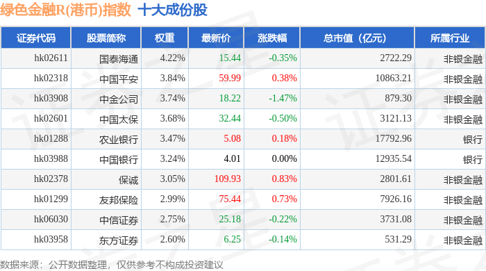 绿色金融R(港币)(480053)指数十大成份股详情如下: