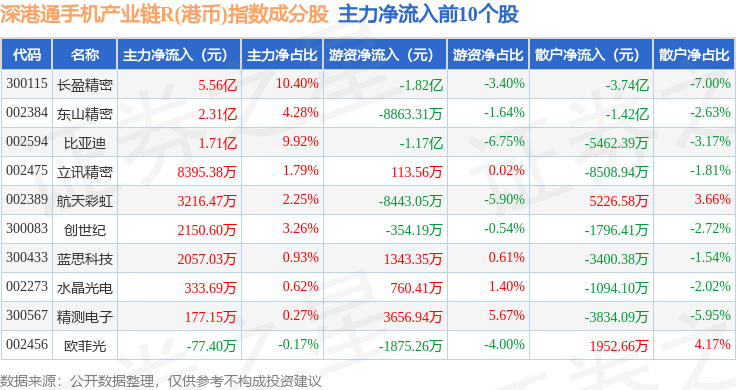 资金流向方面,深港通手机产业链R(港币)(483010)指数成份股当日主力资金净流出合计30.43亿元,游资资金净流入合计10.41亿元,散户资金净流入合计20.02亿元。成份股资金流向详情见下表:
