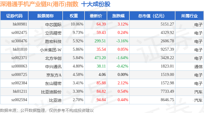 深港通手机产业链R(港币)(483010)指数十大成份股详情如下: