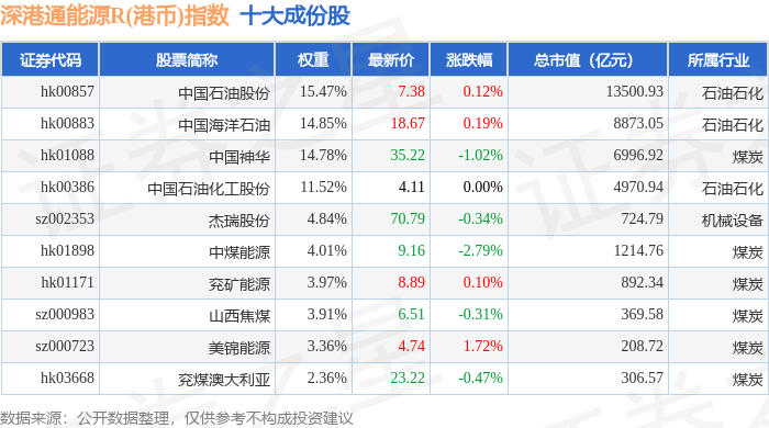 深港通能源R(港币)(483014)指数十大成份股详情如下: