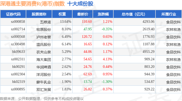 深港通主要消费R(港币)(483022)指数十大成份股详情如下: