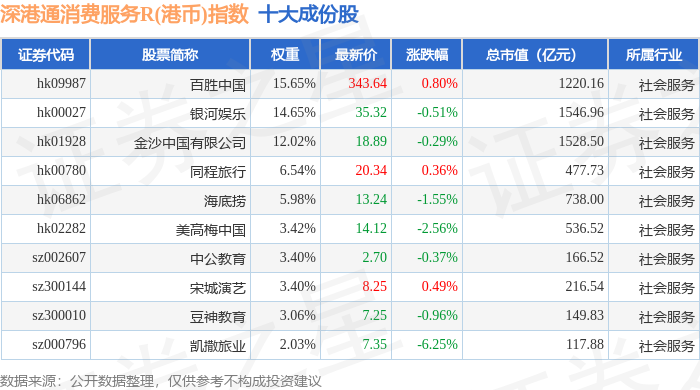深港通消费服务R(港币)(483046)指数十大成份股详情如下: