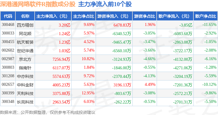 资金流向方面,深港通网络软件R(483047)指数成份股当日主力资金净流出合计4.11亿元,游资资金净流出合计2.87亿元,散户资金净流入合计6.98亿元。成份股资金流向详情见下表: