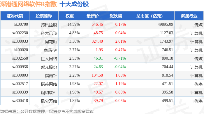 深港通网络软件R(483047)指数十大成份股详情如下: