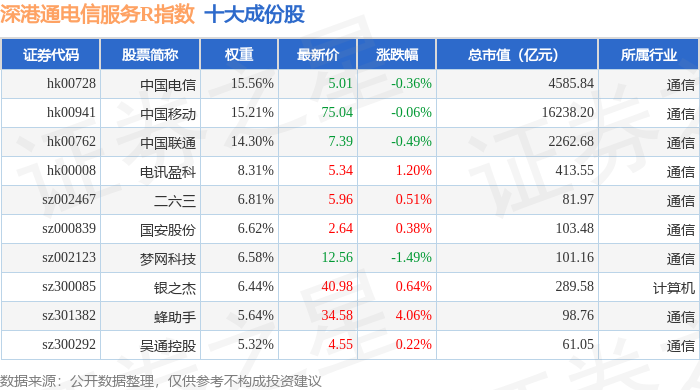 深港通电信服务R(483057)指数十大成份股详情如下: