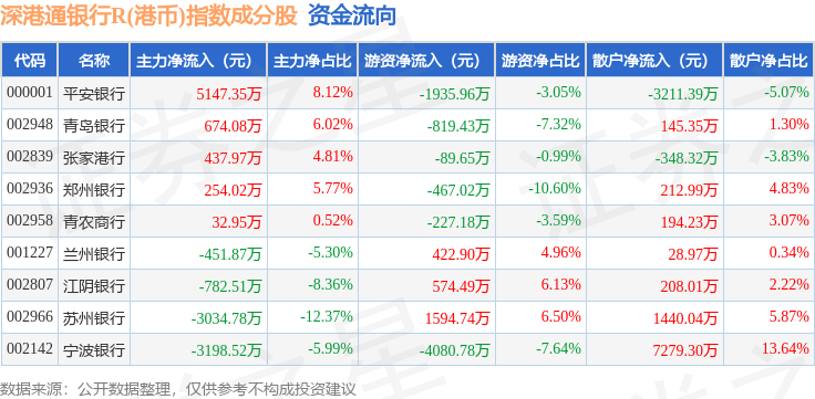 资金流向方面,深港通银行R(港币)(483082)指数成份股当日主力资金净流出合计921.31万元,游资资金净流出合计5027.88万元,散户资金净流入合计5949.19万元。成份股资金流向详情见下表: