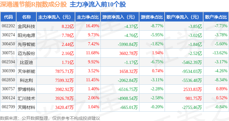 资金流向方面,深港通节能R(483085)指数成份股当日主力资金净流入合计7.56亿元,游资资金净流出合计11.89亿元,散户资金净流入合计4.33亿元。成份股资金流向详情见下表: