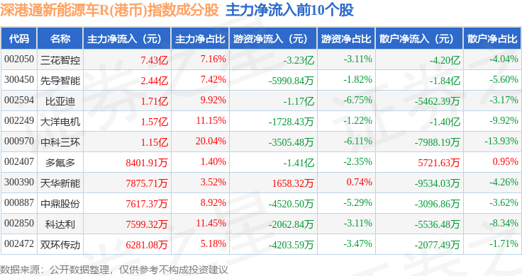 资金流向方面,深港通新能源车R(港币)(483088)指数成份股当日主力资金净流出合计5.56亿元,游资资金净流出合计6.95亿元,散户资金净流入合计12.5亿元。成份股资金流向详情见下表: