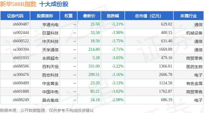 证券之星消息,12月25日,新华500R(489001)指数报收于7587.23点,涨0.26%,成交5823.49亿元,换手率0.61%。当日该指数成份股中,上涨的有310家,水井坊以10.01%的涨幅领涨,下跌的有170家,亨通光电以5.31%的跌幅领跌。