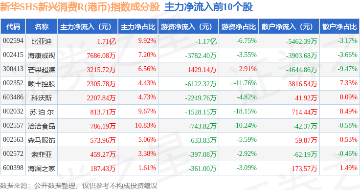 资金流向方面,新华SHS新兴消费R(港币)(489007)指数成份股当日主力资金净流出合计6.76亿元,游资资金净流出合计7905.41万元,散户资金净流入合计7.55亿元。成份股资金流向详情见下表:
