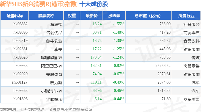新华SHS新兴消费R(港币)(489007)指数十大成份股详情如下: