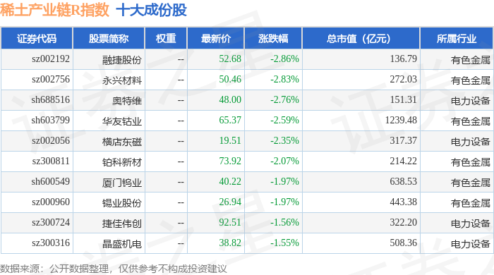 资金流向方面,稀土产业链R(489013)指数成份股当日主力资金净流出合计2.42亿元,游资资金净流出合计6.33亿元,散户资金净流入合计8.75亿元。成份股资金流向详情见下表: