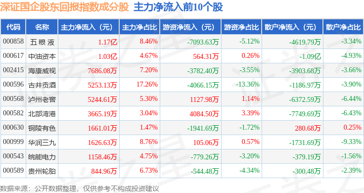 资金流向方面,深证国企股东回报(970064)指数成份股当日主力资金净流出合计2.29亿元,游资资金净流出合计1.16亿元,散户资金净流入合计3.45亿元。成份股资金流向详情见下表: