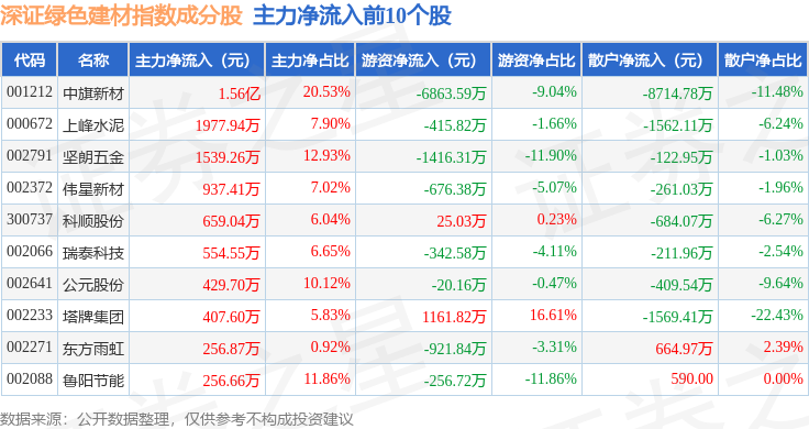 资金流向方面,深证绿色建材(970077)指数成份股当日主力资金净流出合计3.64亿元,游资资金净流出合计9332.23万元,散户资金净流入合计4.57亿元。成份股资金流向详情见下表: