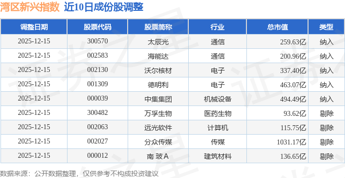 近10日内湾区新兴(980007)指数成份股做了调整,新纳入了5只股票,剔除了4只股票。