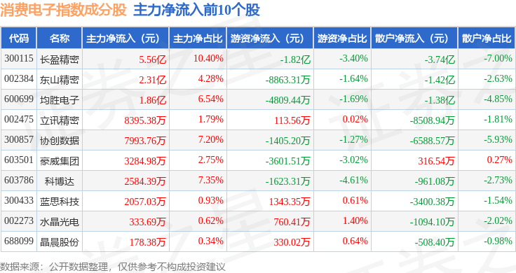 资金流向方面,消费电子(980030)指数成份股当日主力资金净流出合计36.33亿元,游资资金净流入合计12.35亿元,散户资金净流入合计23.98亿元。成份股资金流向详情见下表: