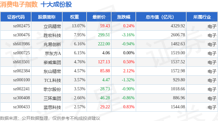 消费电子(980030)指数十大成份股详情如下: