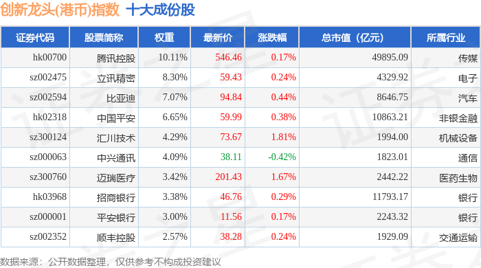 创新龙头(港币)(980037)指数十大成份股详情如下: