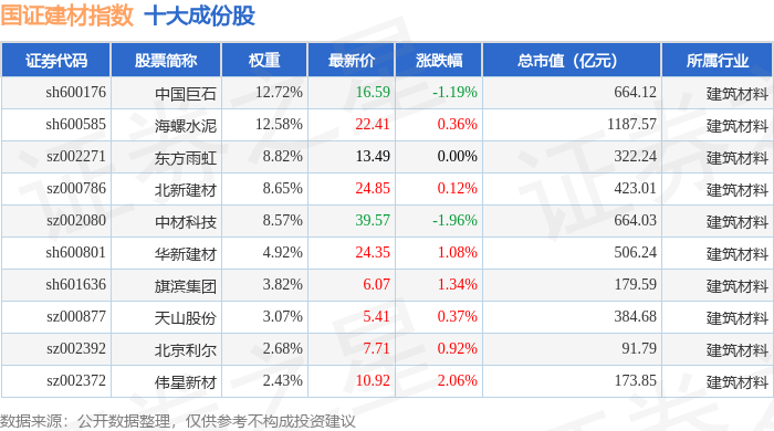 国证建材(980048)指数十大成份股详情如下: