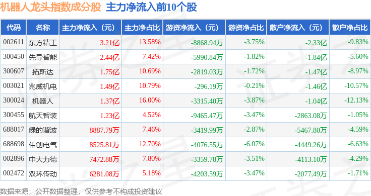 资金流向方面,机器人龙头(980071)指数成份股当日主力资金净流入合计15.77亿元,游资资金净流出合计5.7亿元,散户资金净流出合计10.07亿元。成份股资金流向详情见下表: