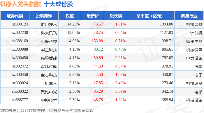 机器人龙头(980071)指数十大成份股详情如下: