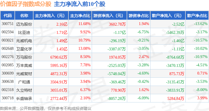 资金流向方面,价值因子(980056)指数成份股当日主力资金净流出合计51.45万元,游资资金净流出合计4.56亿元,散户资金净流入合计4.57亿元。成份股资金流向详情见下表: