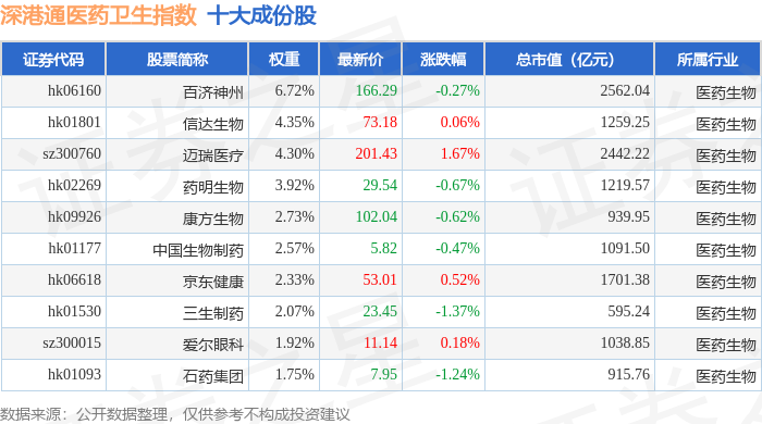 深港通医药卫生(983023)指数十大成份股详情如下: