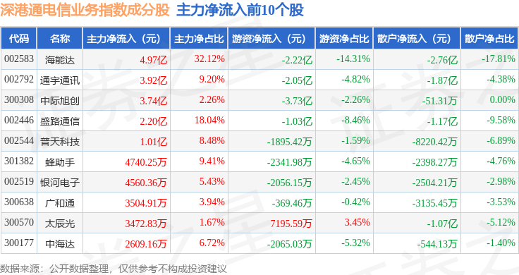 资金流向方面,深港通电信业务(983029)指数成份股当日主力资金净流出合计21.36亿元,游资资金净流入合计8.06亿元,散户资金净流入合计13.31亿元。成份股资金流向详情见下表: