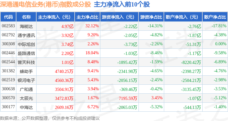 资金流向方面,深港通电信业务(港币)(983030)指数成份股当日主力资金净流出合计21.36亿元,游资资金净流入合计8.06亿元,散户资金净流入合计13.31亿元。成份股资金流向详情见下表: