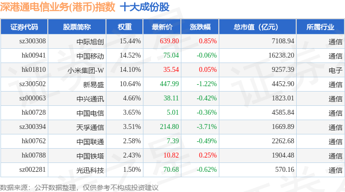 深港通电信业务(港币)(983030)指数十大成份股详情如下: