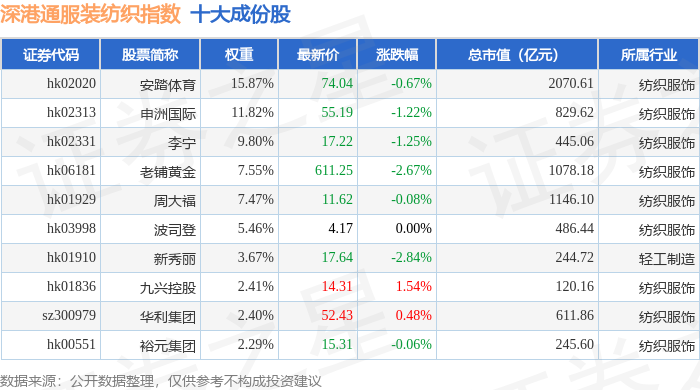 深港通服装纺织(983041)指数十大成份股详情如下: