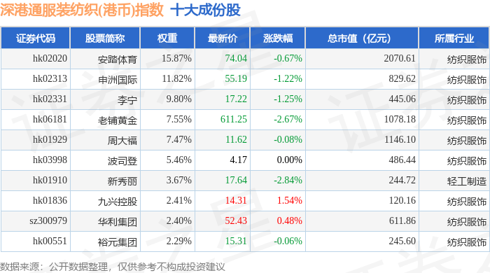 深港通服装纺织(港币)(983042)指数十大成份股详情如下: