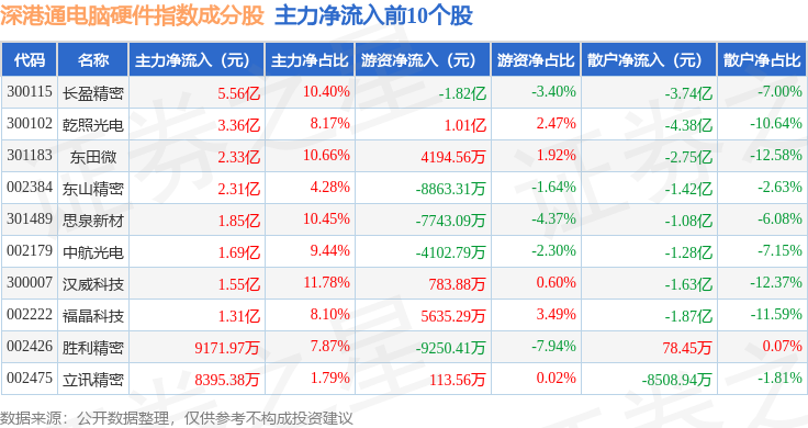 资金流向方面,深港通电脑硬件(983043)指数成份股当日主力资金净流出合计43.04亿元,游资资金净流入合计11.13亿元,散户资金净流入合计31.91亿元。成份股资金流向详情见下表: