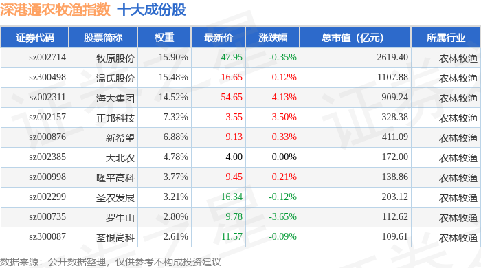 深港通农牧渔(983051)指数十大成份股详情如下:
